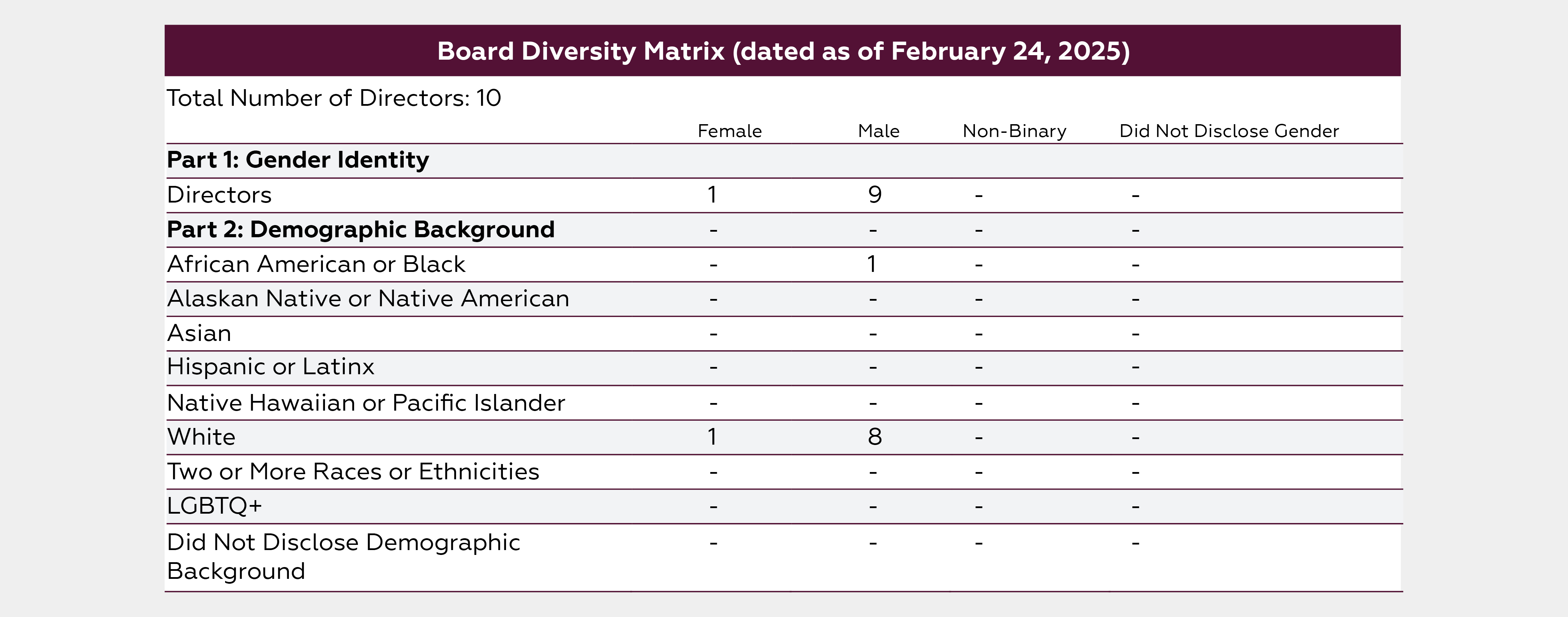 The Board recognizes the importance of director diversity by gender and ethnicity and the positive impact this can have in terms of the perspectives and counsel the Board provides to management. As of December 31, 2023, 20% of the directors self-identified as women or ethnic minorities.